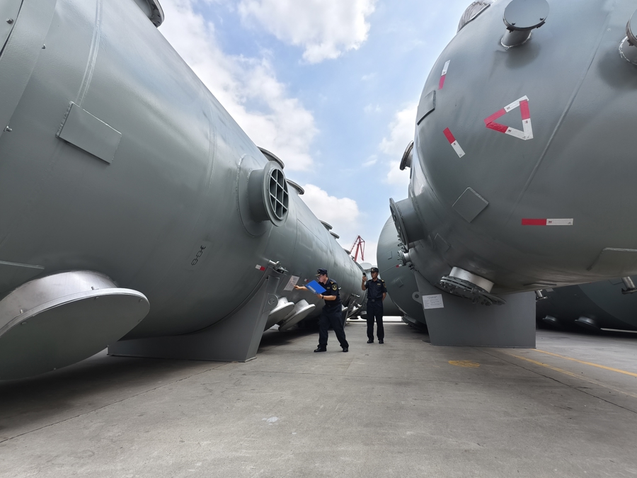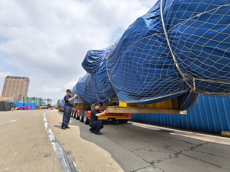上海吳淞海關(guān)對(duì)出口至共建“一帶一路”國家的大型設(shè)備進(jìn)行現(xiàn)場(chǎng)監(jiān)管。(路慎利 攝)